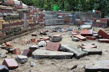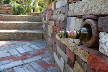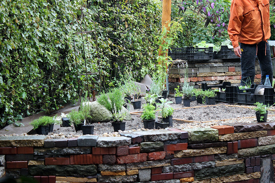 Nachdem die entsprechenden Flächen freigebaggert waren, waren als erstes die Terrasse und die Form gebenden Mauern dran. Patchwork-Stil hatten wir uns ausgesucht, das heißt, es wurden unsere alten Platten mit verschiedenen anderen Steinen gemixt. Übrigens alles Steine, die schon mehrere Jahrzehnte auf dem Buckel haben. Baumrausch greift viel auf Materialien zurück, die bei anderen Umbauten gerettet wurden und in neuen Projekten wiederverwendet werden können.