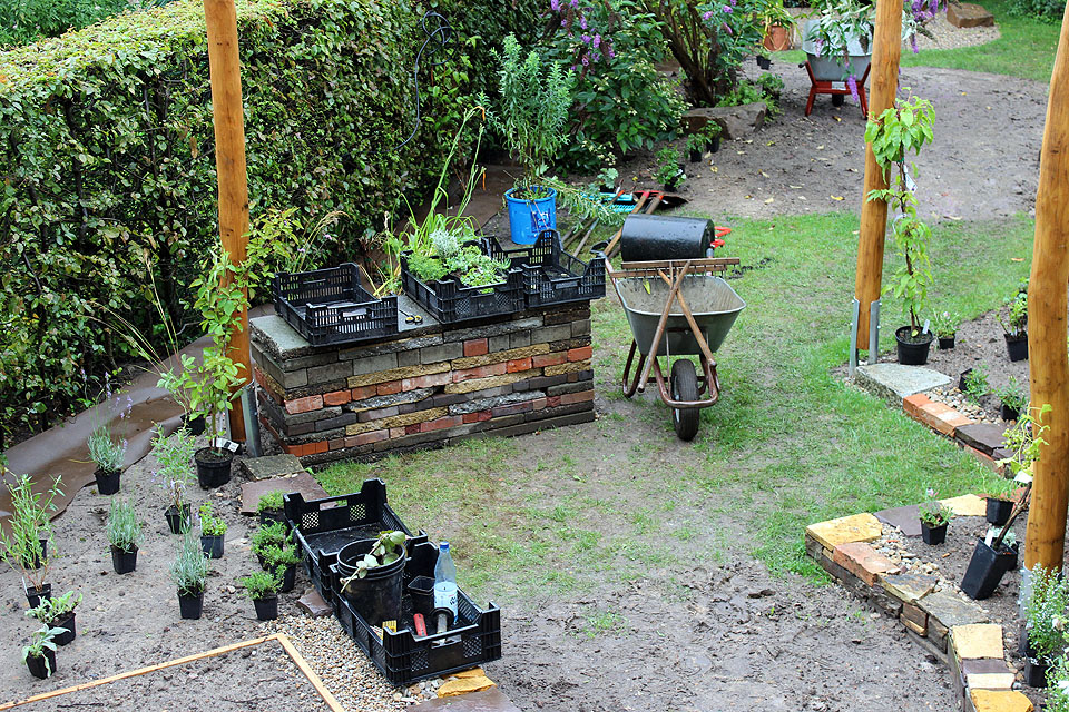 Im ersten Schritt hat Baumrausch einen maßstabsgerechten Entwurf als Vorschlag gezeichnet. Den sind wir durchgegangen und haben noch die ein oder andere Ergänzung untergebracht. Danach wurden erstmal die eigenen Hemdsärmel hochgekrempelt, denn die Vorbereitungen haben wir selbst übernommen: alte Terrasse zurückbauen, einen Fliederbaum fällen (da blutete mir ein bißchen das Herz) sowie alle Beete von Pflanzen und Unkraut befreien.