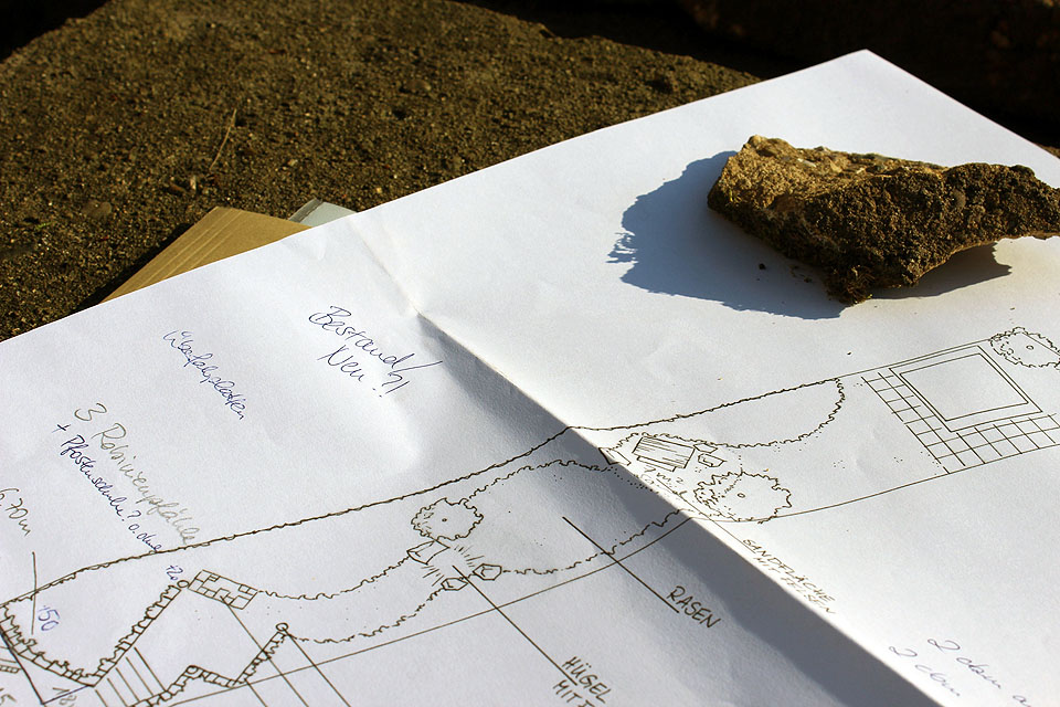 Visionen hatten wir also, gingen damit allerdings nicht zum Arzt, sondern suchten das Gespräch mit Freunden und Bekannten. Irgendjemand, so hofften wir, würde von einem Landschaftsbüro oder Ähnlichem wissen, das ein bißchen alternativ-kreativ denkt statt Gärten wie aus dem Baumarkt-Katalog anzulegen. Und siehe da, ich bekam den entscheidenden Tipp: